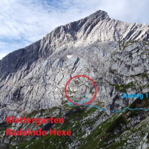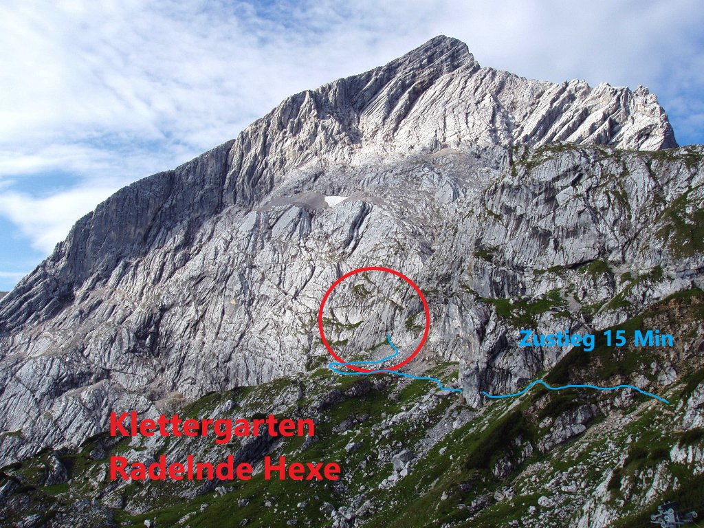 Der hochfrequentierte Klettergarten "Radelnde Hexe" liegt im Bereich unterhalb der Alpspitze. Dieses Gebiet ist durch die Osterfelderbahn gut zu erreichen und erfreut sich großer Beliebtheit. Er wird sehr häufig von Familien mit Kindern und jungen Kletterern besucht, die eine gute Absicherung erwarten. Weiter absolvieren die Schülerinnen der St.-Irmengard-Schule hier ihr alljährliches alpines Praktikum. Auch die Kinder-/Jugendgruppe der DAV Sektion Garmisch-Partenkirchen kann erste praktische Erfahrungen im alpinen Bereich sammeln. -Weiter sind die heimischen Bergwachten zu Übungszwecken und Lehrgängen in diesem Klettergarten vertreten. Die Absicherung der insgesamt 20 Kletterrouten ist zum größten Teil bereits über 40 Jahre alt und wird von keiner öffentlichen Stelle kontrolliert oder sicherheitstechnisch in Stand gehalten. Die Mitglieder der Projektgruppe Klettergarten "Radelnde Hexe" haben es sich deshalb zur Aufgabe gemacht, die Kletterrouten sicherheitstechnisch aufzuwerden.